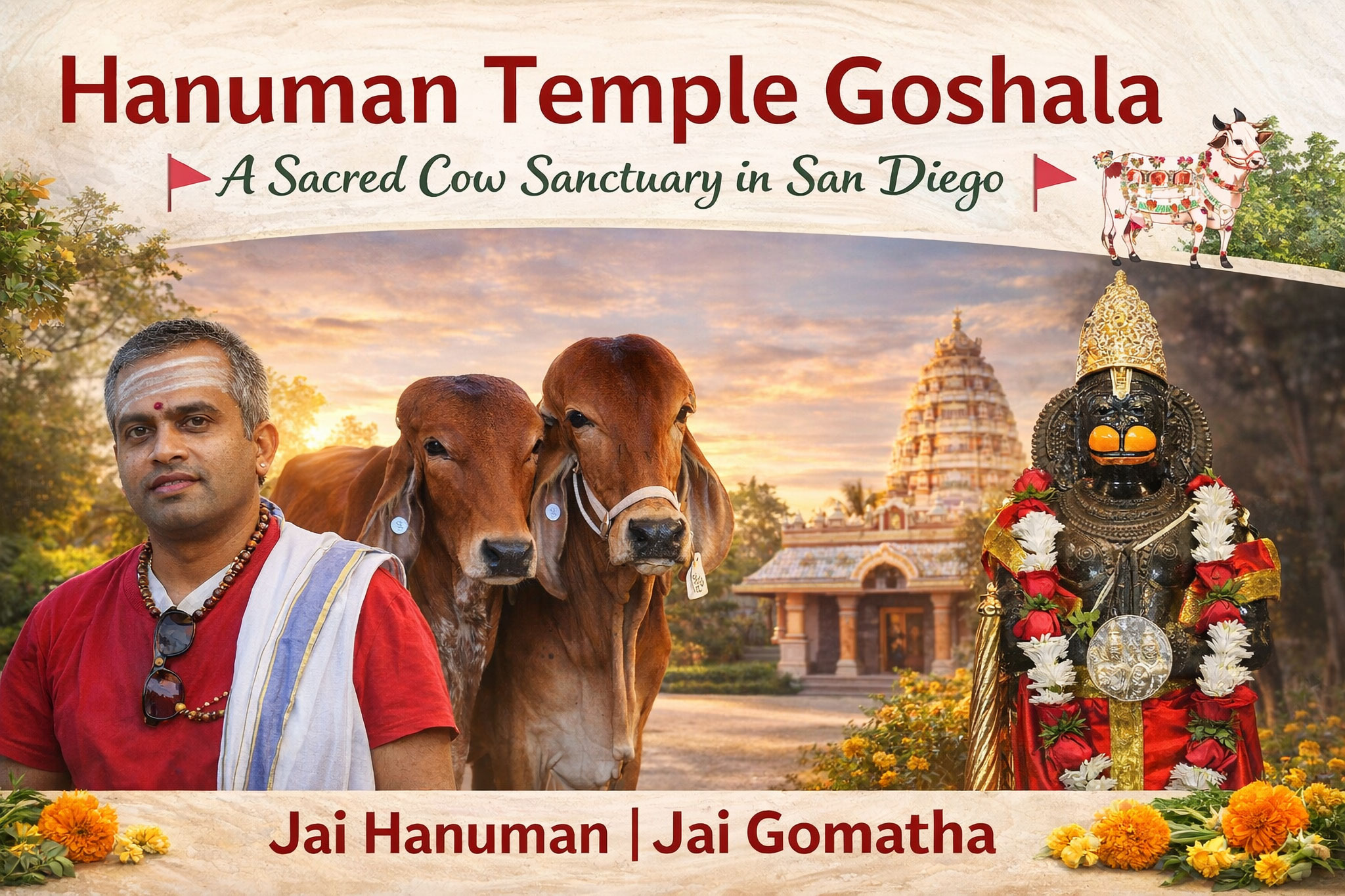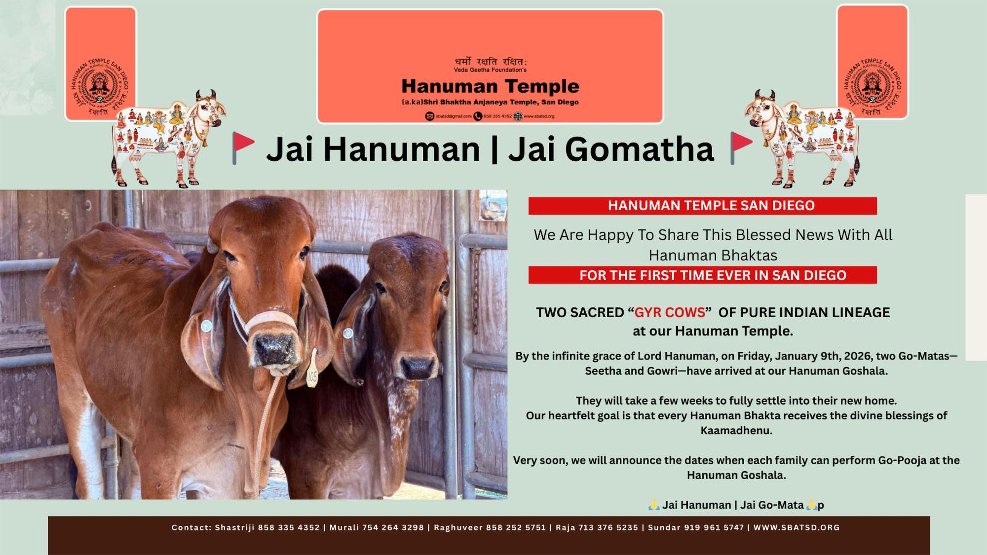 Hanuman Temple Goshala brings the divine tradition of Go-Seva to San Diego, California. By the grace of Lord Hanuman, our sacred GYR cows Seetha & Gowri reside on Hanuman Temple land in Poway — the first goshala in San Diego serving our community.