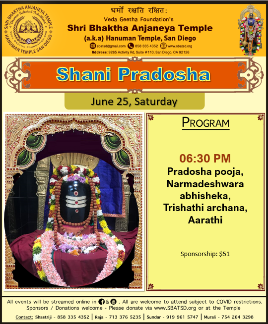 Shani Pradosha June 26, 2022 @ 1:30 AM - 4:00 AM PDT Shri Bhaktha Anjaneya Temple 9265, Activity Rd, Suite #110, San Diego, CA, United States Events will be streamed online. All are welcome subject to COVID restrictions. SPONSORS / DONATIONS WELCOME.