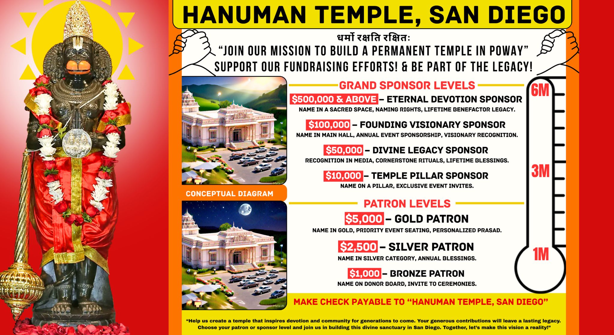 Hanuman Temple is planning to purchase a 10 acre property in Sabre Springs (Close to Poway). It’s a site atop a hill overlooking a panoramic view. Please feel free to contact the temple and visit the site! You will feel the divine energy!