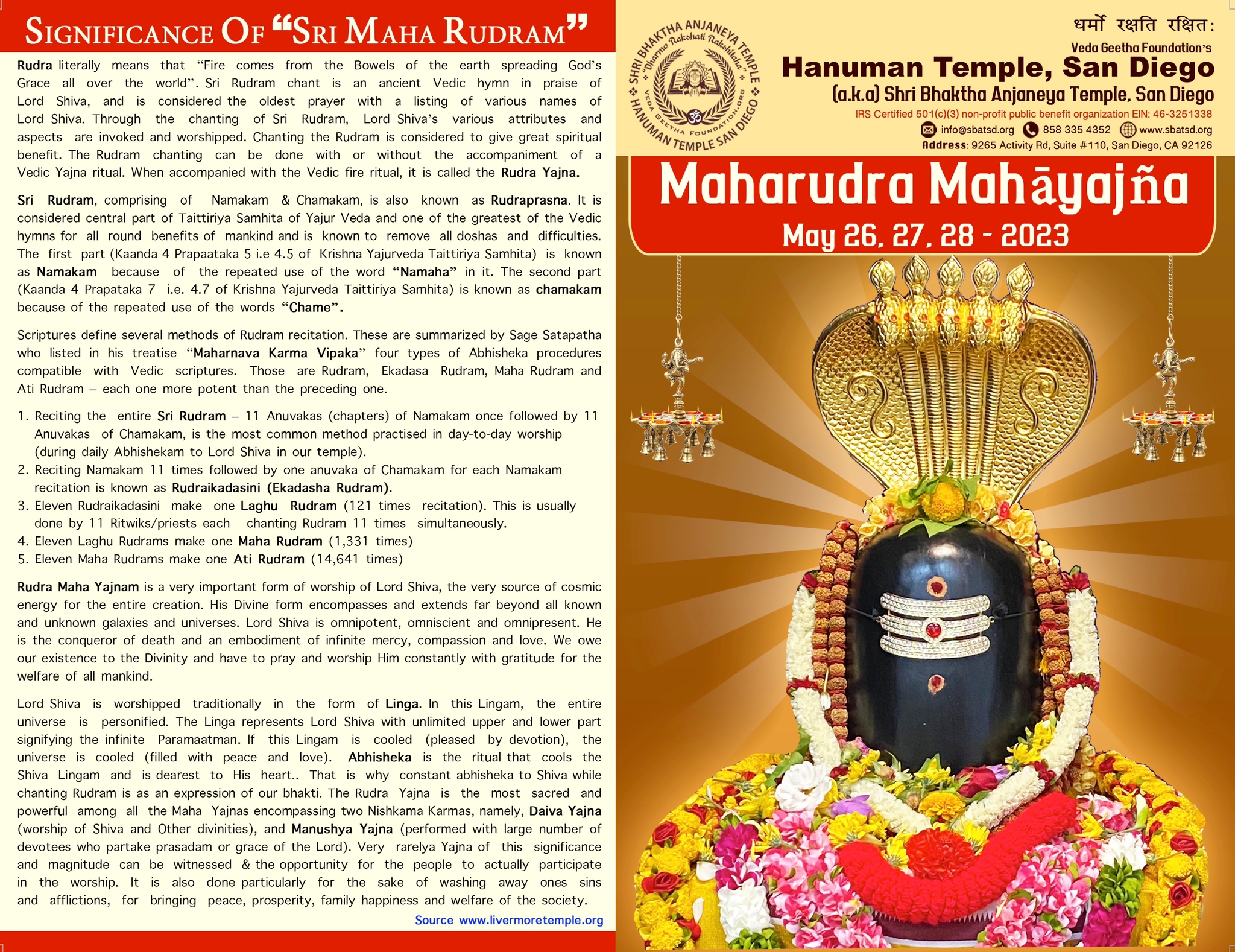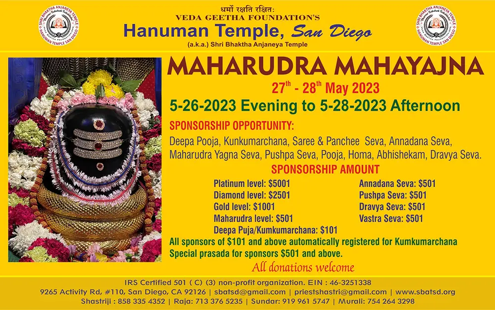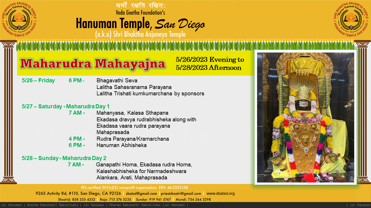 | May 27 2023 (Saturday) | 7am | Mahanyasa Kalasa Sthapana Ekadasa Dravya Abhisheka along with Ekadasa Rudra Parayana |