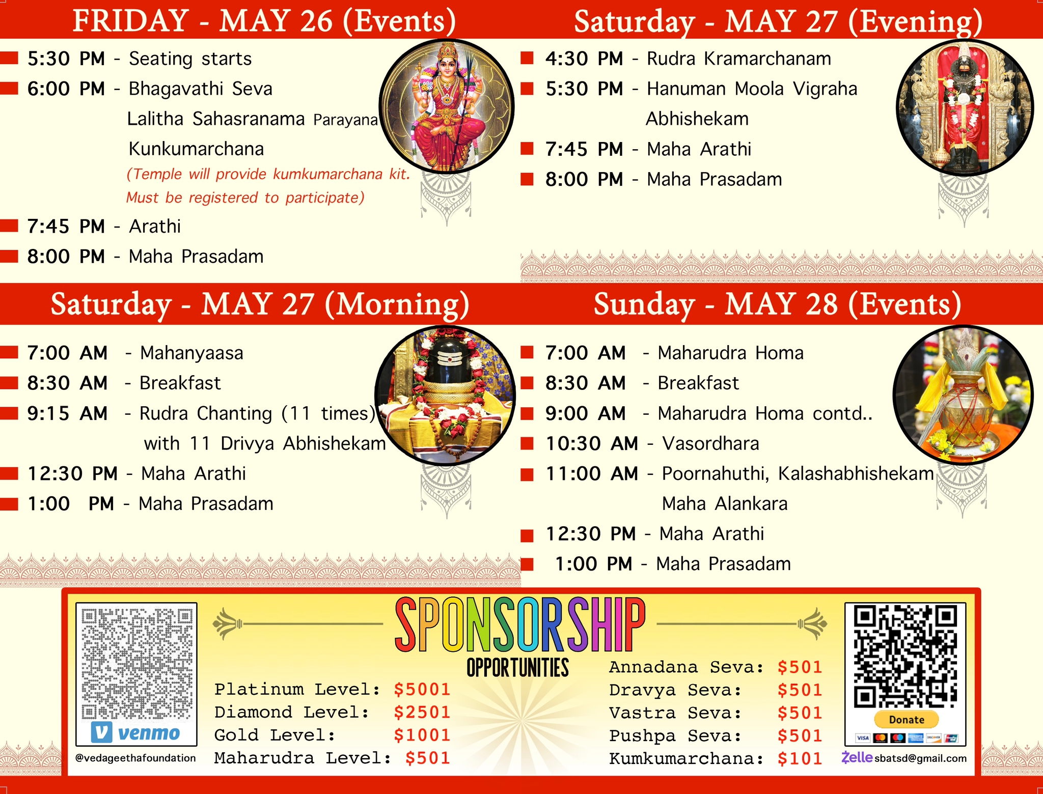 | May 26 2023 (Friday) | 6pm | Bhagavati Seva Lalitha Sahasranama Parayana Trisathi Kumkumarchana |